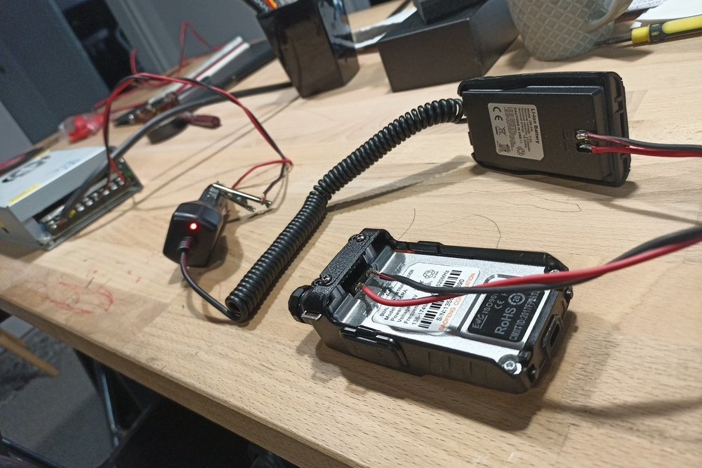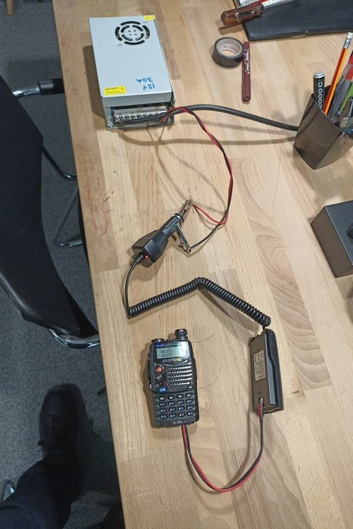 Μια πτώση στο δάπεδο ενός φορητού Baofeng UV-5R είχε ως αποτέλεσμα να σπάσει το κλιπάκι που συγκρατεί τη μπαταρία στο σασί με αποτέλεσμα το UV-5R ουσιαστικά να αχρηστευτεί για φορητή χρήση. Η μόνη ελπίδα να ξαναλειτουργήσει ήταν να πάρει μόνιμη παροχή ρεύματος και να χρησιμοποιηθεί ως μηχάνημα βάσης μόνο για ακρόαση. Τα υλικά που χρησιμοποιήθηκαν είναι : Ένα switching τροφοδοτικό 12V 30A που έτυχε να υπάρχει διαθέσιμο στο συρτάρι. Άνετα η τροφοδοσία μπορεί να γίνει και με ένα τροφοδοτικό 12V ~5A καθώς η κατανάλωση του baofeng δεν ξεπερνά το 1Α σε ακρόαση (ίσως να λέω και πολλά..) Ένας αντάπτορας φόρτισης από μπαταρία αυτοκινήτου. Προσοχή η έξοδός του να είναι 7.5V - 8.0V ! Tα απαραίτητα καλώδια σύνδεσης , κολλητήρι κτλ. Η συνδεσμολογία είναι σχετικά απλή και δεν έχει ιδιαίτερο βαθμό δυσκολίας. Προσοχή χρειάζεται στην πολικότητα +/- σε όλες τις συνδέσεις, να γίνουν καλές και σταθερές κολλήσεις και να προφυλαχθούν οι εκτεθειμένες επαφές όταν τελειώσει το σετάπ. Φυσικά με αυτή τη συνδεσμολογία δεν πατάμε PTT αλλά μπορούμε να έχουμε το φορητό μας μόνιμα ανοικτό σε ακρόαση. Εάν δεν σας βρίσκεται αντάπτορας φόρτισης αυτοκινήτου με έξοδο 7.5V - 8.0V μπορείτε να χρησιμοποιήσετε ένα step down κύκλωμα από τα 12V στα 8V που είναι και η τάση που εργάζεται το Baofeng UV-5R. Tέτοια step down κυκλώματα (με ρυθμιζόμενο dimmer τάσης εξόδου) βρίσκονται εύκολα και οικονομικά εδώ : https://www.aliexpress.com/item/33004374185.html H εικόνα της τελικής συνδεσμολογίας :